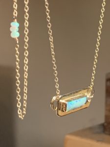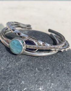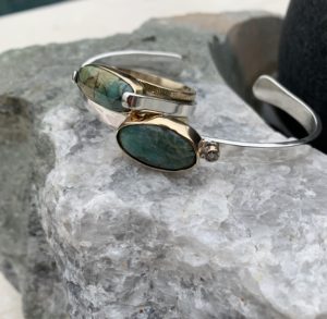 Stacker bracelets that speak softly of the sea, from the Gulf to the Atlantic. Deep blue sea glass from the Atlantic and Peruvian blue opal that glows when the sun shines through it’s pierced bezel. Wear one or stack them and listen to them jingle they’re music.