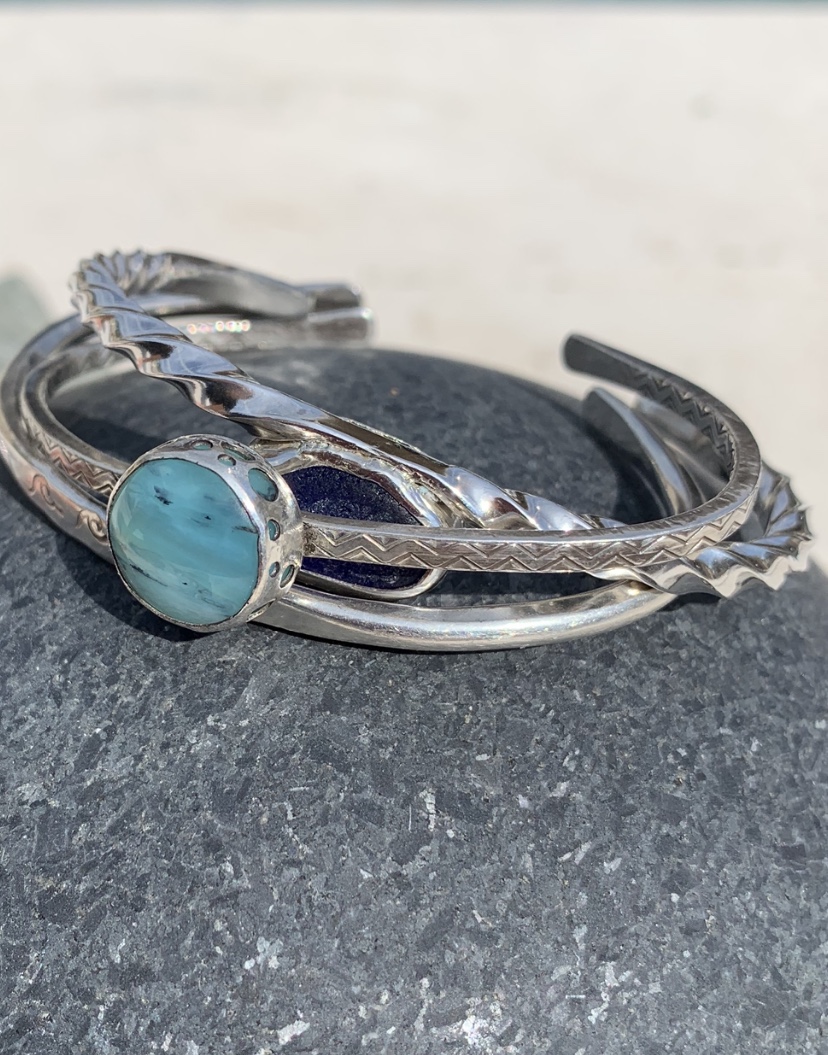 Stacker bracelets that speak softly of the sea, from the Gulf to the Atlantic. Deep blue sea glass from the Atlantic and Peruvian blue opal that glows when the sun shines through it's pierced bezel. Wear one or stack them and listen to them jingle they're music.