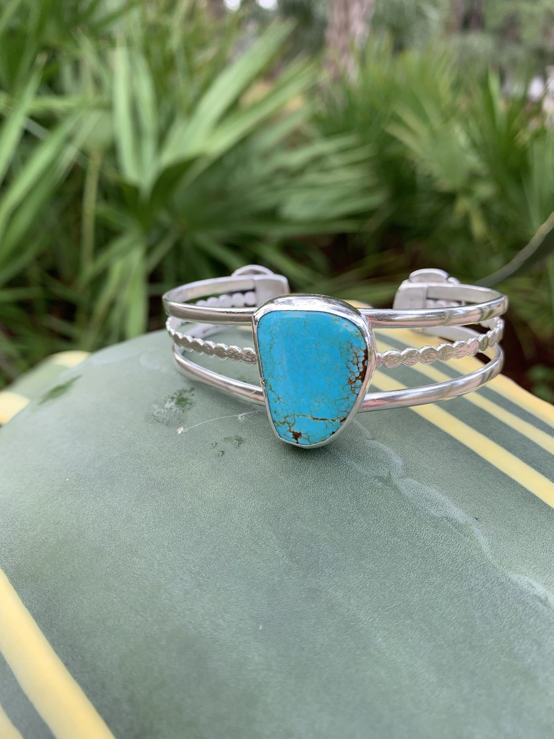 This stunning piece of turquoise from the closed #8 mine has a hue reminiscing a clear blue sky. The sand dollar and shell take you under that blue sky to the beach with sand between your toes, the smell of salt water and the sounds of surf rolling in.