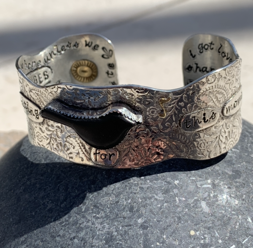 This 16gauge sterling silver anticlastic cuff bracelet is adorned with an Apache tears obsidian black bird that was only waiting for this moment to arise. I was inspired to write inside the cuff after listening to a clip of Jon Batiste and Rep John Lewis at the barbershop having a ...