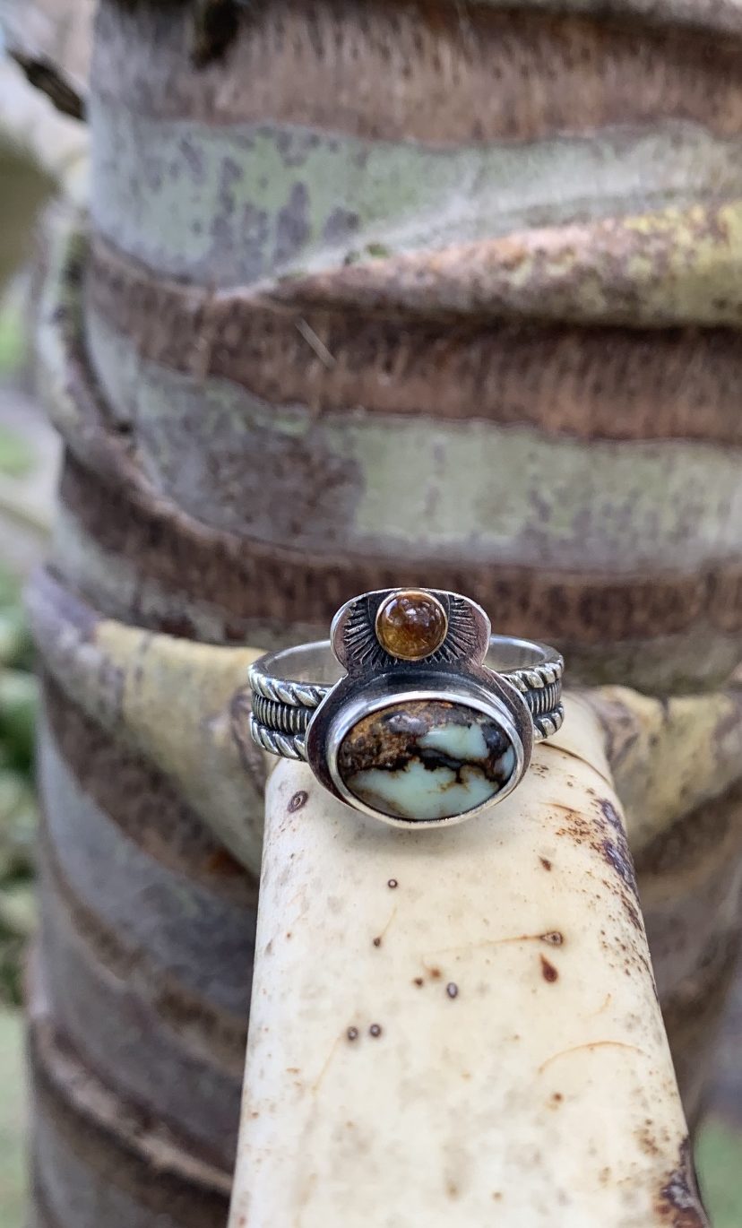 This Seven Dwarfs turquoise is set with an amber cabochon into sterling silver.  Size 8 & 1/2.